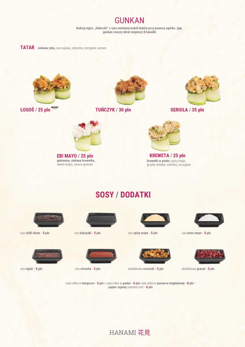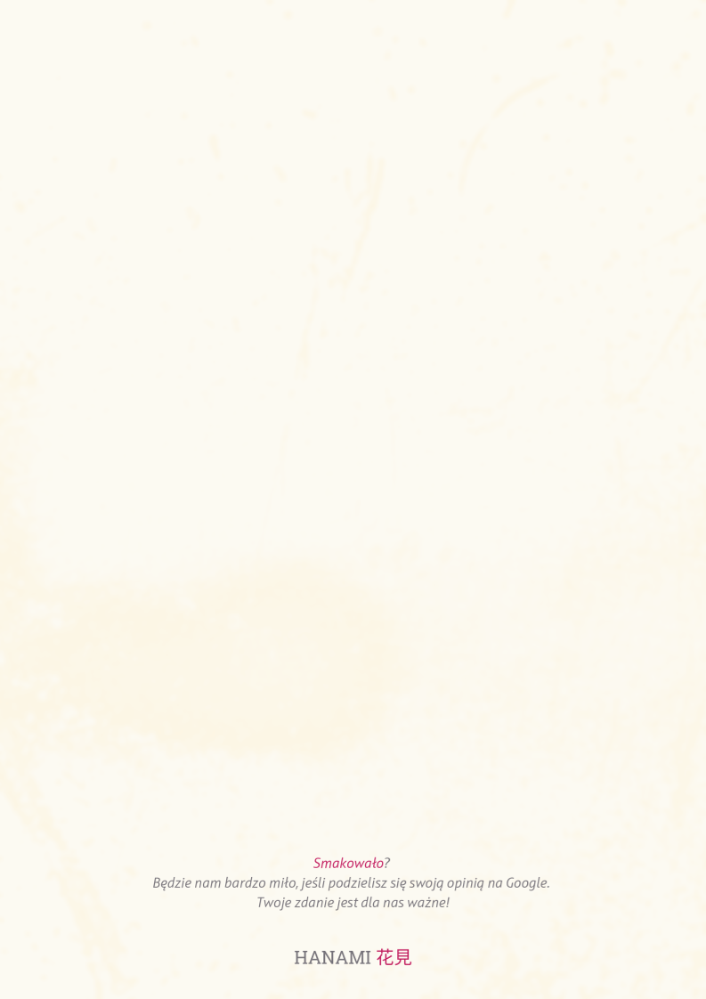 Poznaj HANAMI 花見 Sushi – Twoją małą Japonię w sercu Szczecina, na Ryneczku Pogodno. Nasza kulinarna przygoda zaczęła się ponad 20 lat temu, a ostatnią dekadę poświęciliśmy na doskonalenie rzemiosła kuchni japońskiej. W Hanami serwujemy sushi w autorskim stylu – unikalny miks zachodu z klasyką kuchni japońskiej, inspirowany naszymi podróżami po Azji. Oferujemy pyszne zestawy sushi, opcje wegetariańskie (wege) oraz menu lunchowe w atrakcyjnych cenach. Zapraszamy do naszego kameralnego lokalu – mamy stoliki w środku oraz letni ogródek z hokerami. Jesteśmy miejscem przyjaznym psom 🐾 Zamów sushi z dostawą na terenie Szczecina lub odbierz osobiście na Pogodnie. Poczuj naszą pasję do gotowania!